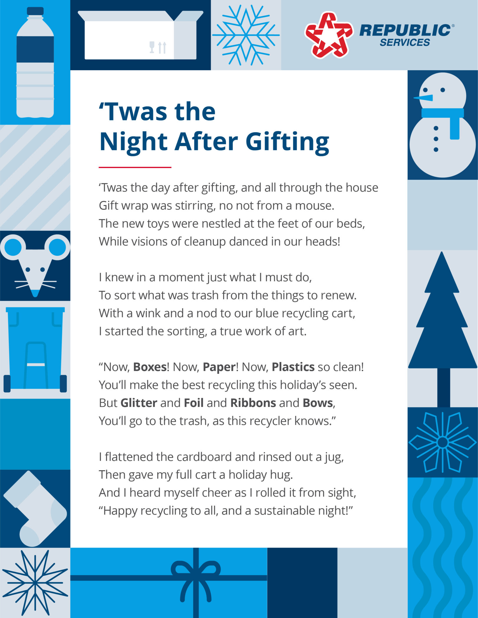 Unwrap a fun holiday rhyme that makes post-gift cleanup simple. Discover which items should head to the recycling cart—and which belong in the trash—after the festivities wind down.